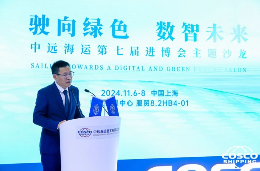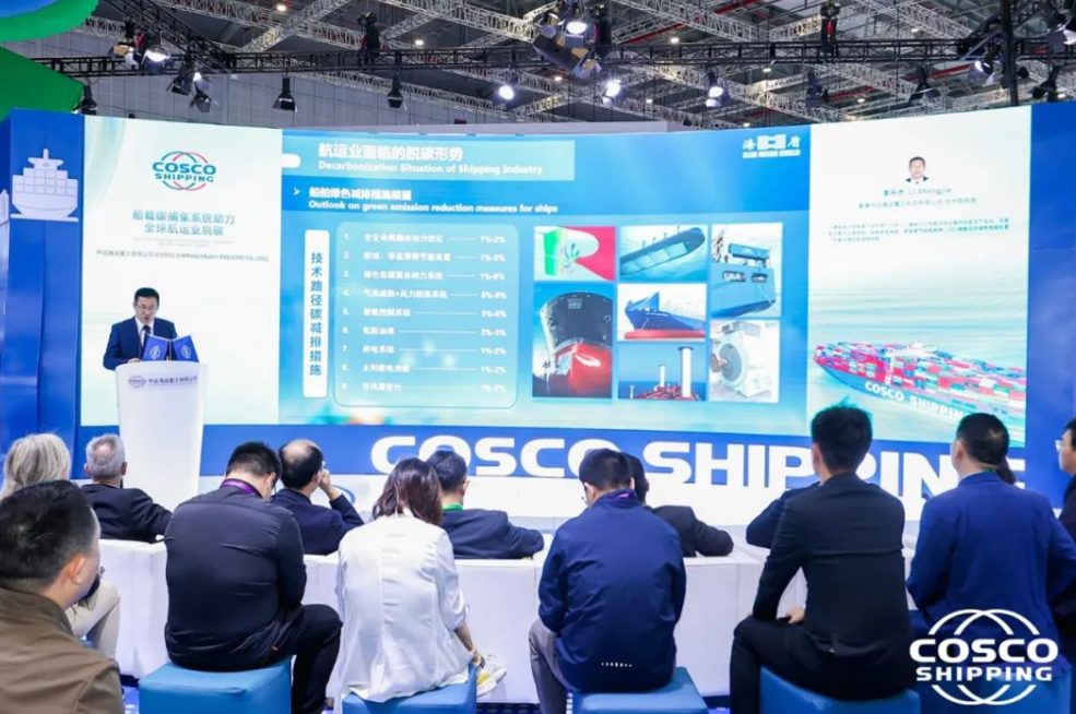 11月7日,南通远洋配套/威海重工科技,在第七届中国国际进口博览会中远海运集团 “驶向绿色数智未来”主题沙龙活动中发表《船载碳捕集系统助力全球航运业脱碳》主题演讲由南通远洋配套/威海重工科技技术中心经理李升杰主讲